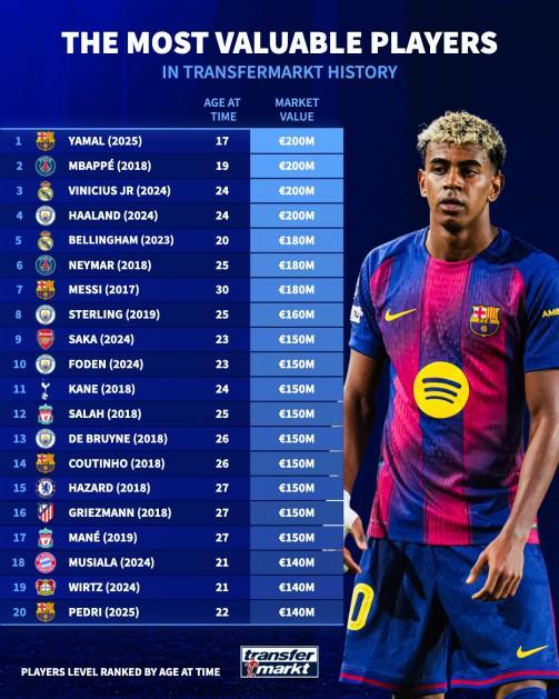 1. 亚马尔(2025年/17岁/巴塞罗那) 2亿欧元